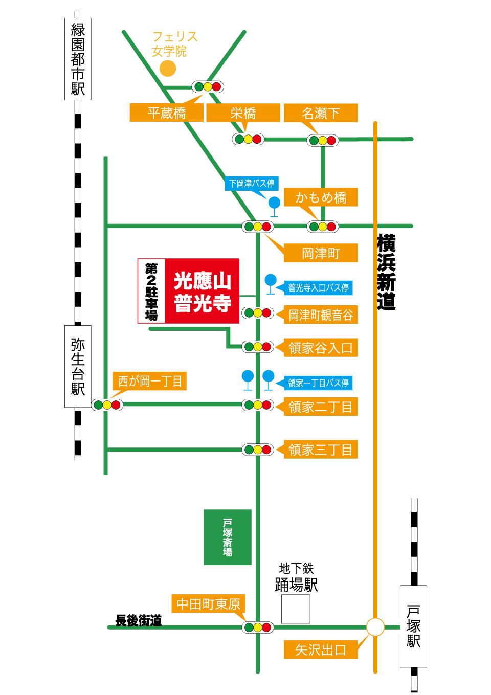 領家谷入口の信号より裏道に入っていただき、すぐに右折して、突き当たりを左折、墓地沿いに上がっていただければ、すぐになります。